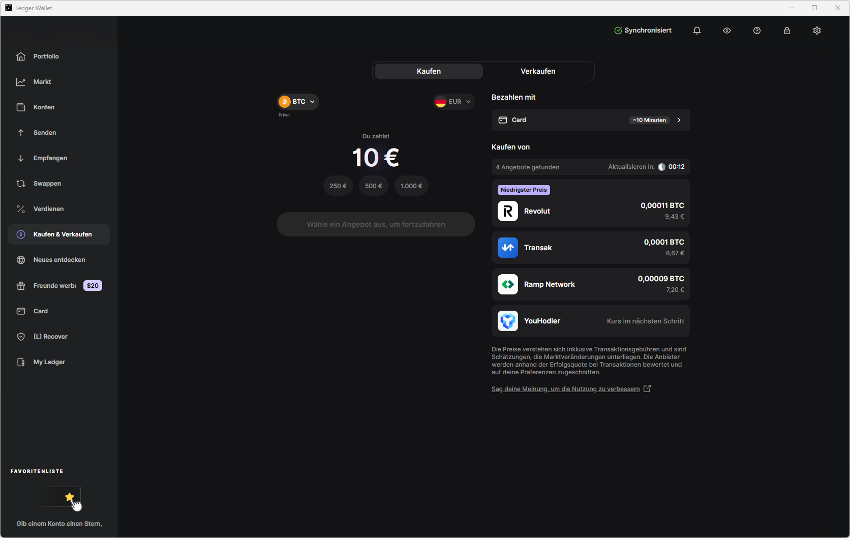 Ledger Wallet zeigt dir nun verschiedene Partner wie Revolut, MoonPay, oder Coinify an. Du kannst die Anbieter basierend auf dem besten Kurs, den Gebühren und deiner bevorzugten Zahlungsmethode auswählen. Je nach Anbieter kannst du per Kreditkarte, Banküberweisung, Apple/Google Pay oder teilweise sogar über Revolut-Integrationen zahlen.